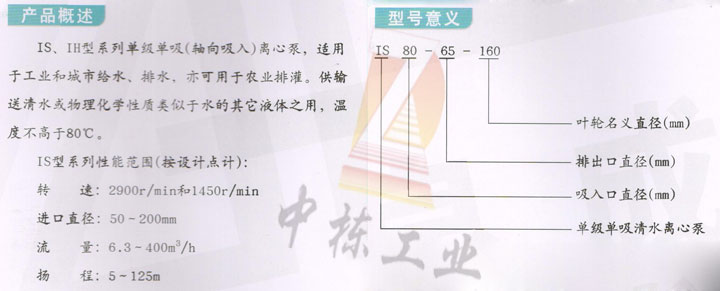 IS離心泵,系根據(jù)國(guó)際標(biāo)準(zhǔn)ISO2858所規(guī)定的性能和尺寸設(shè)計(jì)的新型單級(jí)單吸臥式清水離心泵,其技術(shù)標(biāo)準(zhǔn)均向國(guó)際標(biāo)準(zhǔn)靠攏,通用性廣,全系列共140種規(guī)格,但只用四種軸;同一規(guī)格的軸,軸承,軸封,葉輪緊固件等均能互換;全系列泵的懸架也只有四種。達(dá)到國(guó)際先進(jìn)水平。它是我國(guó)推廣的節(jié)能泵類(lèi)產(chǎn)品之一。泵為后開(kāi)式,拆開(kāi)泵蓋和葉輪時(shí)不需拆卸吸水和排出管路。懸架內(nèi)裝有兩個(gè)滾珠軸承,用機(jī)器油或潤(rùn)滑脂潤(rùn)滑。泵通過(guò)彈性聯(lián)軸器由電動(dòng)機(jī)直接驅(qū)動(dòng)。蝸室、腳、進(jìn)水法蘭和出水法蘭鑄成一個(gè)整體。供吸送清水及物理化學(xué)性質(zhì)類(lèi)似水不含固體顆粒的液體。它廣泛適用于工農(nóng)業(yè)及城市、排水、消防供水等。
